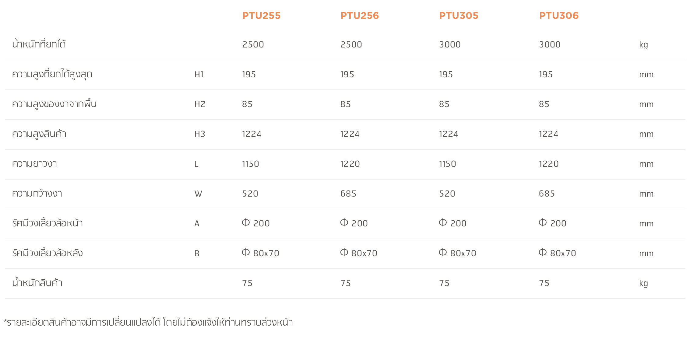 | น้ำหนักที่ยกได้ | 2500 | 2500 | 3000 | 3000 | kg | |